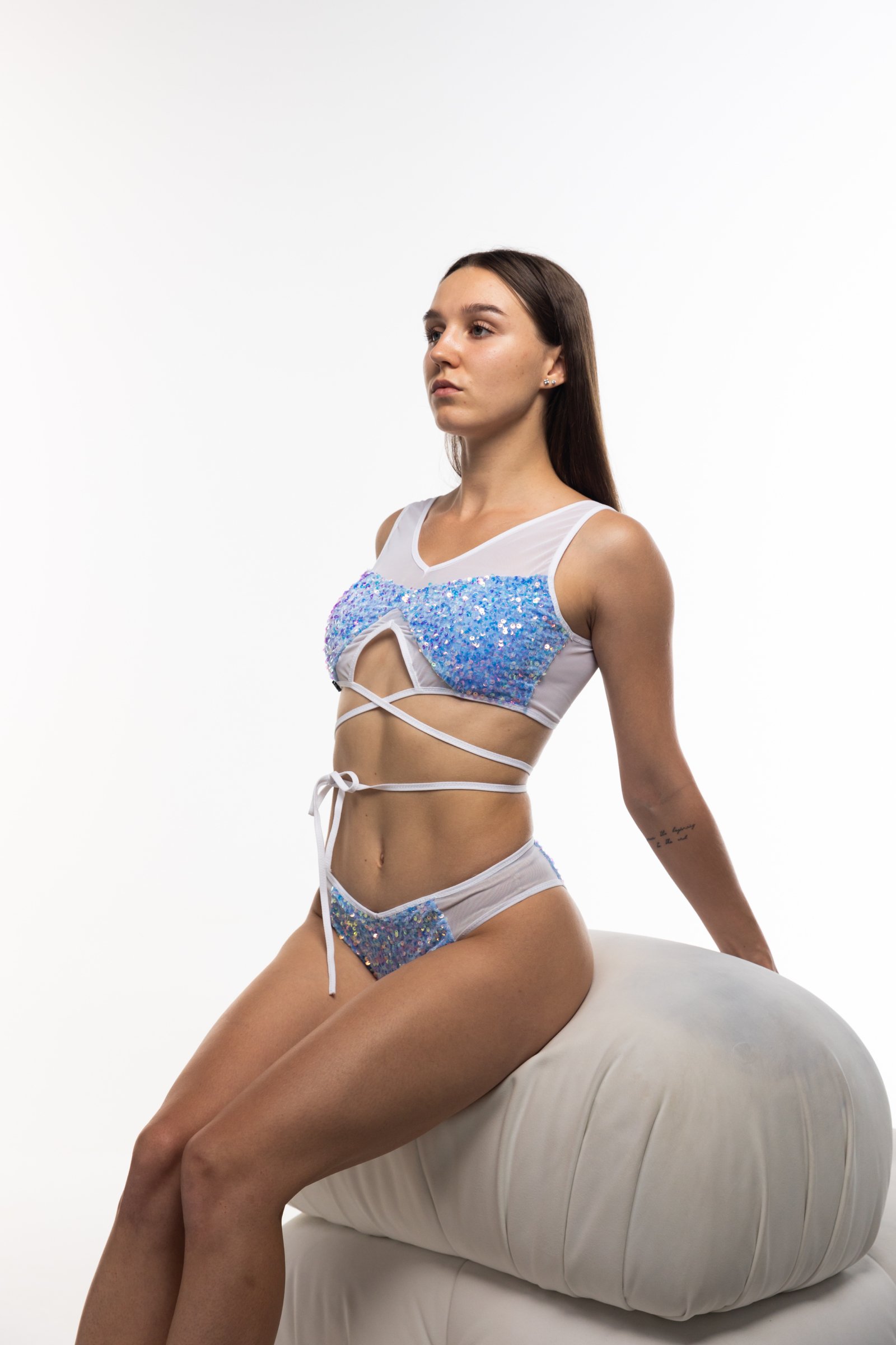 Цей блискучий комплект поєднує прозору м’яку сітку з розкішними паєтками, даруючи відчуття легкості та спокуси. Завдяки заниженій посадці шортів і регульованим бретелям він ідеально підкреслює фігуру та додає впевненості на сцені. Ідеальний для pole dance, go-go виступів та шоу, де зустрічаються елегантність і сила.