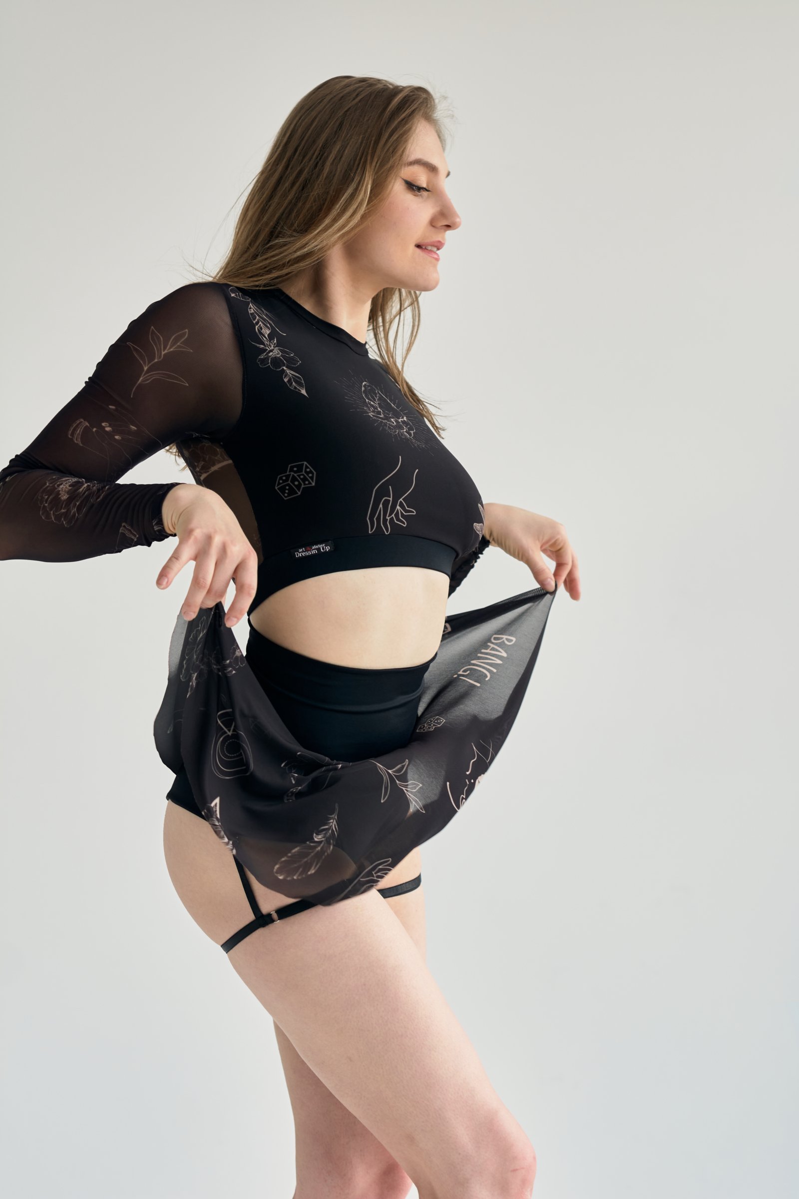Розкрий свою внутрішню арт-енергію — рашгард Dance Tattoo поєднує м’яку прозору сітку з витонченим ілюзійним принтом татуювання, що рухається разом із тілом. Легкий силует підкреслює природні лінії та додає образу загадковості й елегантності у кожному русі. Ідеальний для pole dance, exotic flow, розтяжки, contemporary хореографії та експресивних фотосесій — створений, щоб надихати на впевненість і творчість.