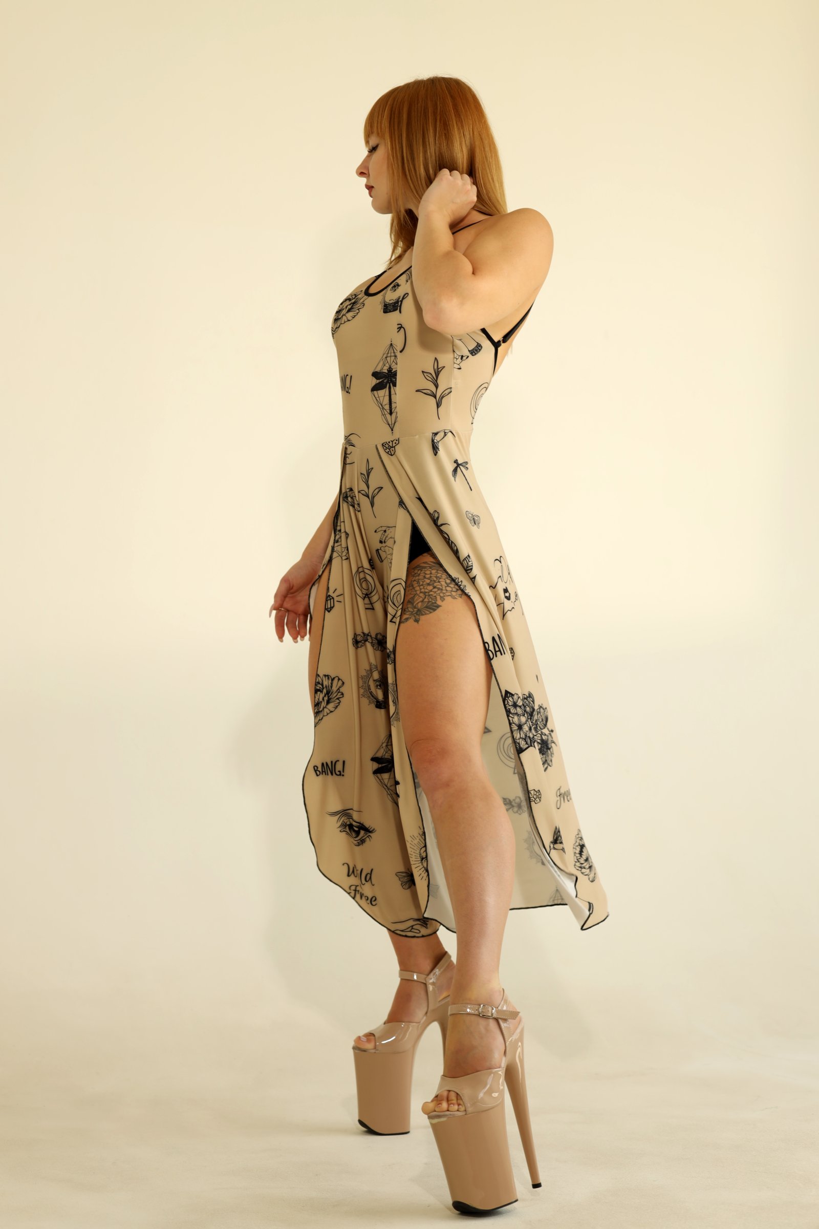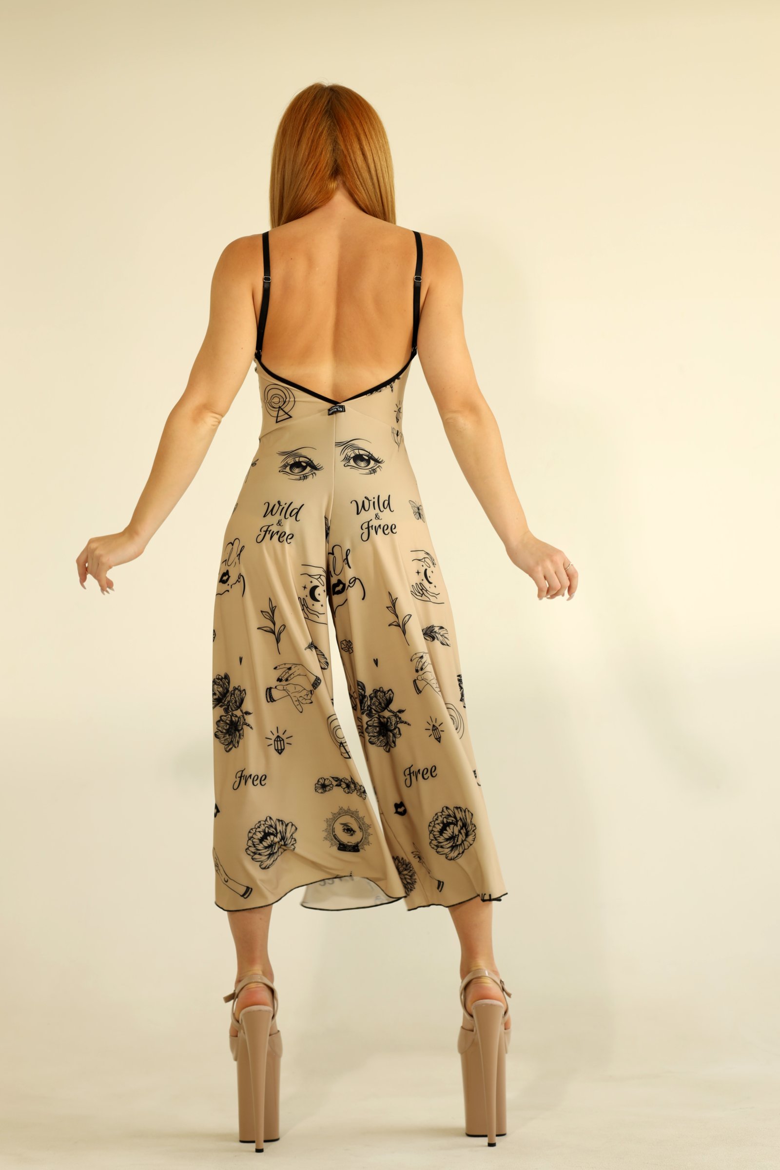 Вільний, сміливий і сповнений характеру — комбінезон Flying Exo Tattoo поєднує художній принт із плавністю руху. Широкі літаючі штани створюють динамічний, невагомий ефект, а глибокі вирізи та відкрита спина підкреслюють природний ритм тіла. Легкий, м’який до шкіри матеріал дозволяє рухатися без обмежень, роблячи кожен рух виразним і живим. Ідеальний для pole dance, exotic-виступів або сцени — цей комбінезон створений, щоб рухатися, виражати себе та захоплювати погляди.