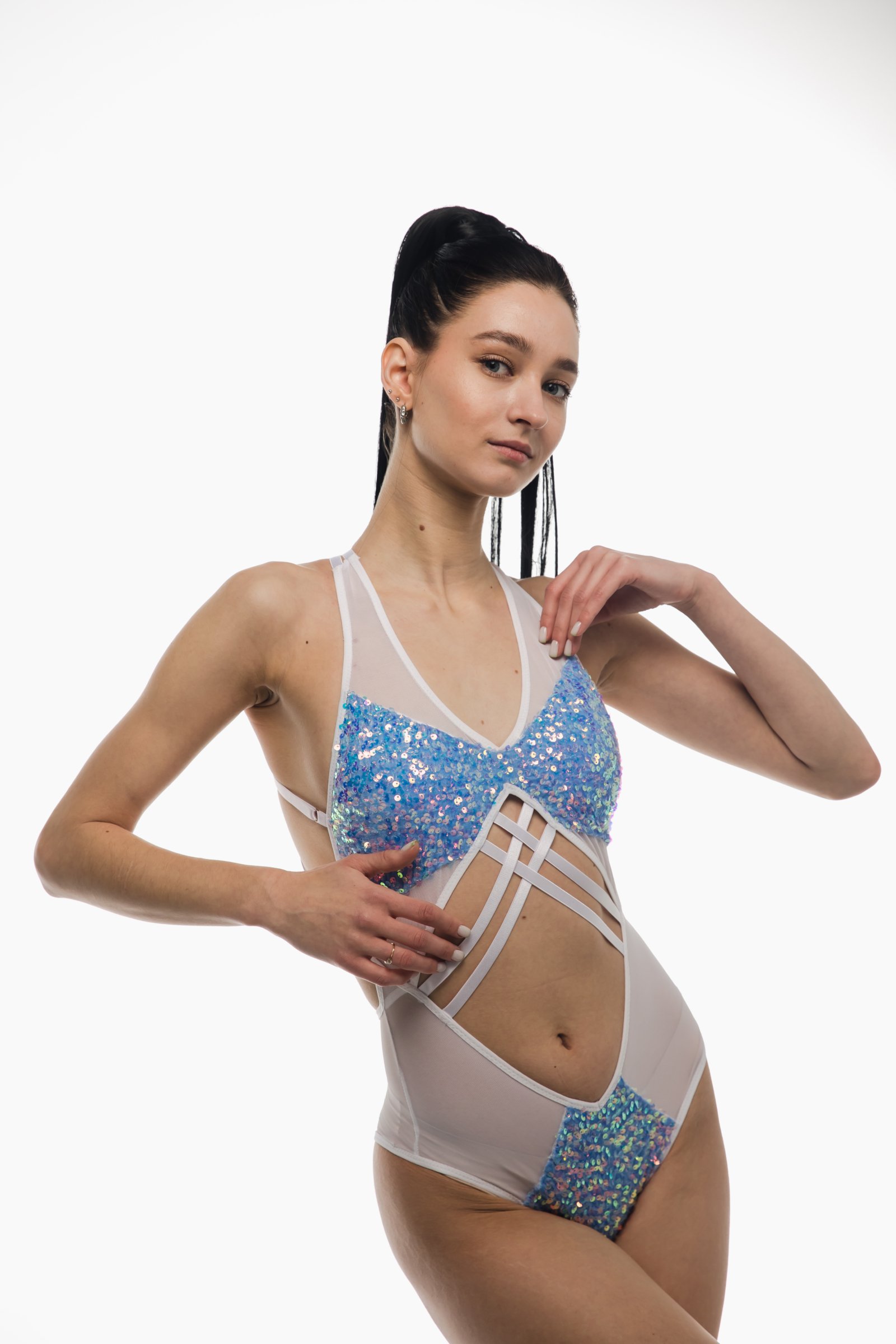 Розкрий своє внутрішнє сяйво — Боді SEQUIN створене для тих, хто впевнено володіє сценою. Мерехтливі паєтки у поєднанні з прозорою сіткою та сміливими вирізами створюють ефектний, звабливий образ. Перехресні бретелі красиво формують талію, підкреслюючи силует, а відкрита спина додає легкості, свободи руху та сценічної привабливості. Ідеальний вибір для яскравих виступів під світлом софітів — для тих, хто любить сяяти в кожному русі.