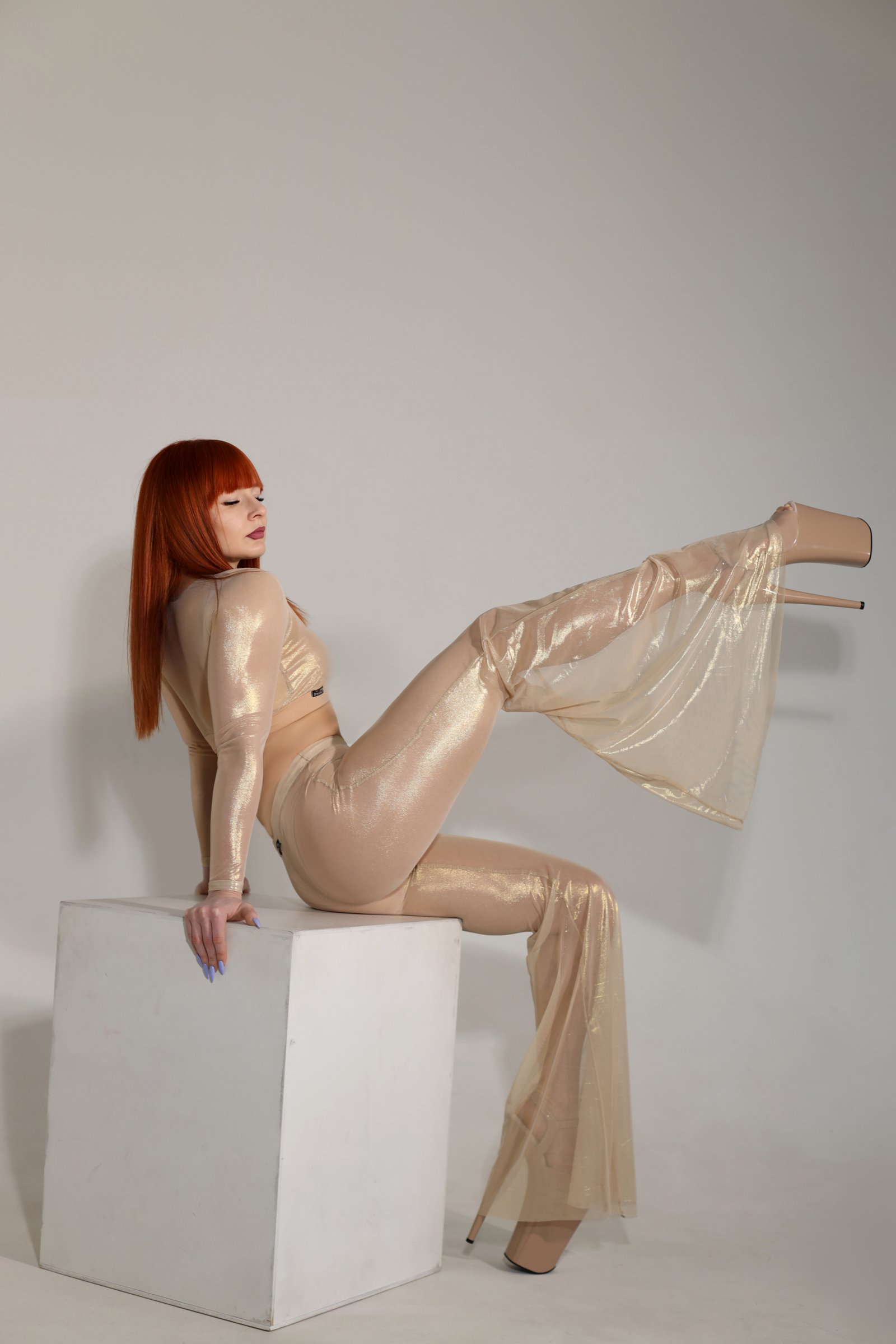 Глянцеві, плинні та гіпнотичні — Штани Shine Disco створені для сцени. Блискуча сітчаста тканина з фольгованим покриттям вловлює кожен промінь світла, створюючи дзеркальний сяючий ефект у русі. Кльош нижче коліна додає драматичності та плавності, а широкий пояс красиво формує силует і забезпечує комфортну підтримку. Ця модель створена для тих, хто народжений сяяти — від pole до go-go і далі.