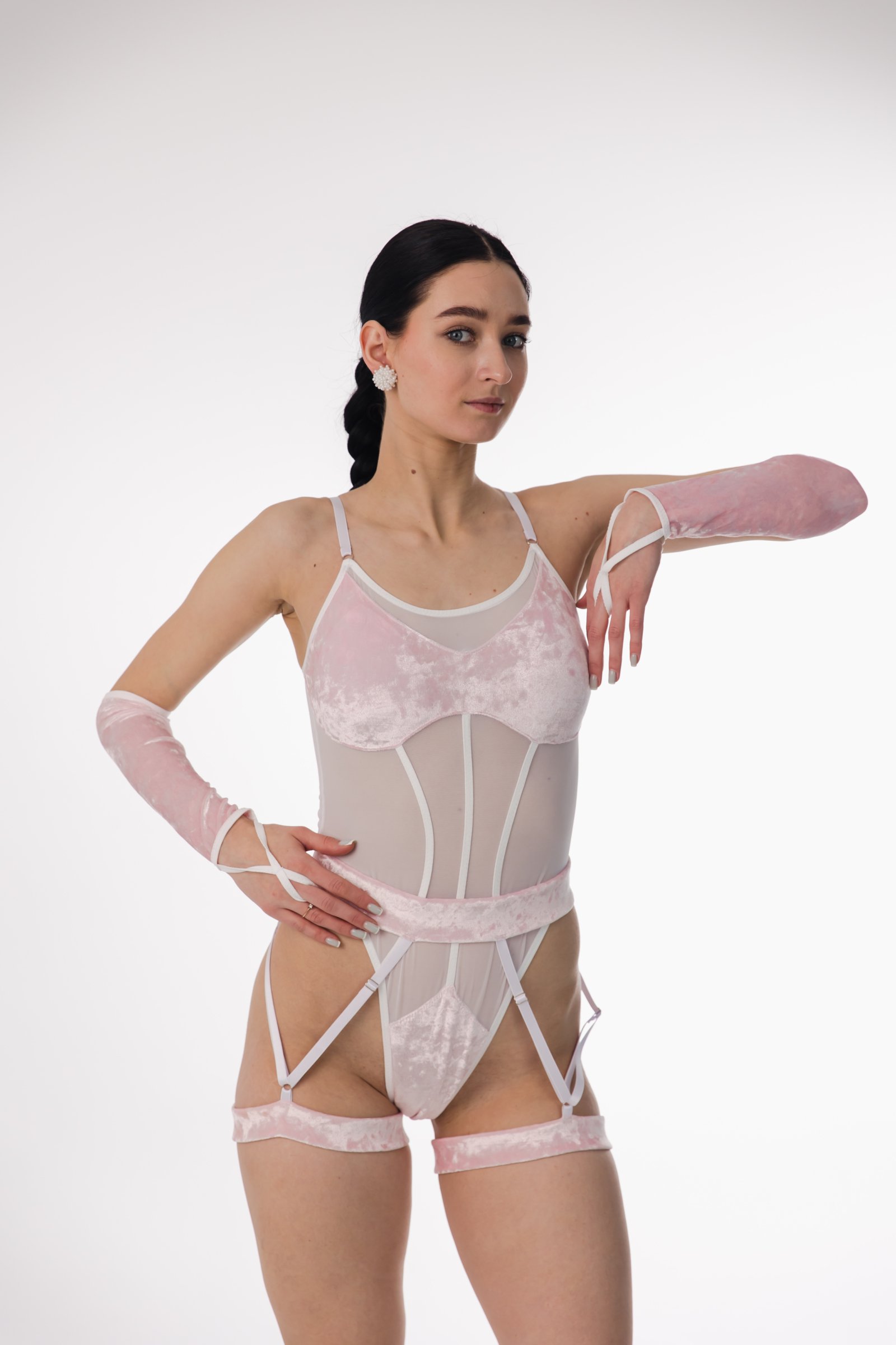 Це боді створене, щоб підкреслити форму тіла та сформувати витончений і ніжний силует. Модель ASTREA натхненна небесною богинею чистоти та світла і втілює елегантність, легкість і жіночність. Поєднання м’якого оксамиту та напівпрозорої сітки створює делікатний і водночас чуттєвий образ Корсетні лінії підкреслюють талію та формують гармонійний силует а регульовані гартери додають витонченого акценту. Довгі оксамитові рукавички завершують образ створюючи вишуканий сценічний стиль М’яка еластична тканина забезпечує комфорт і свободу рухів під час виступів фотосесій та тренувань